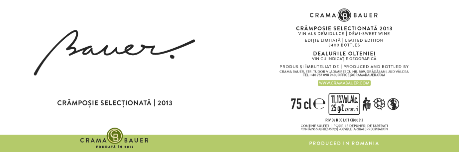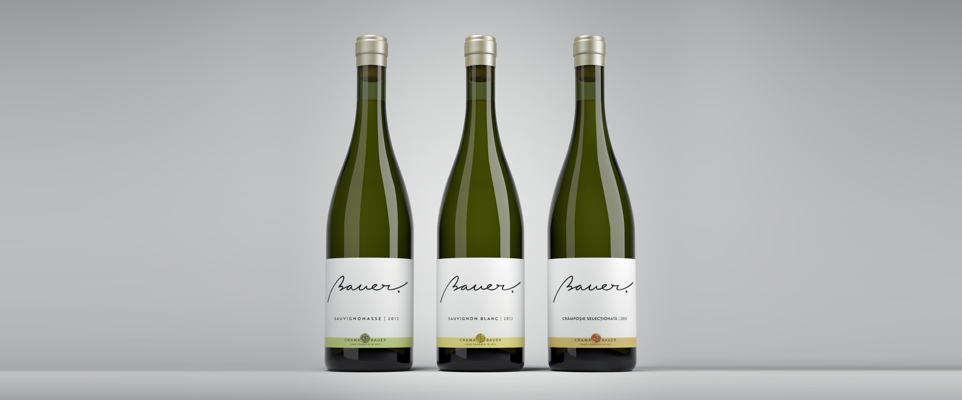 În spiritul ideii de „vin de semnătură” am creat o etichetă-suport pentru semnătura amplă, puternică, tipărită în relief pe hârtie cu textură specială. Studiind etichetele de vin aflate pe piață am preferat un design minimalist pentru Crama Bauer, sticla distingându-se imediat pe raft și comunicând instantaneu atât brandul – Bauer – cât și categoria vinului, cu ajutorul benzii de culoare de la baza etichetei.