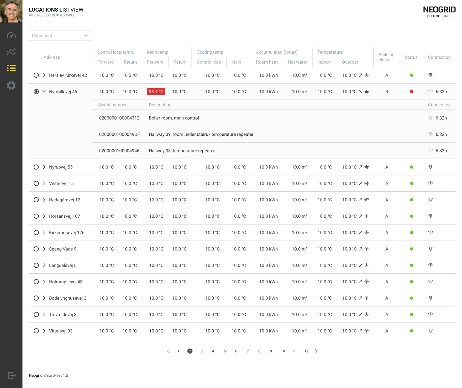 Pentru asta există Locations Listview – Lista Locațiilor – un tabel detaliat al diverselor adrese ale clădirilor administrate cu PreHEAT. Tabelul prezintă indicatori cheie ai sistemului – parametrii sistemului de încălzire, valorile consumului de agent termic, clasa energetică a clădirii, starea senzorilor, chiar și prognoza meteo locală. Rândul oricărei locații poate fi extins pentru a accesa detalii și mai... detaliate.