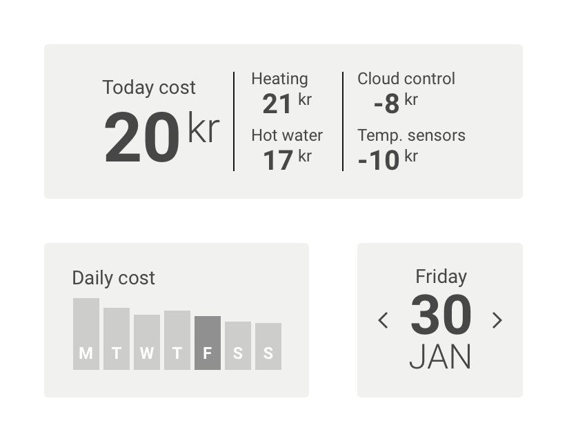 Daily Cost – Costul Zilnic – este un element multifuncțional interesant. La o primă vedere se poate observă tendința cheltuielilor pe parcursul săptămânii. Ziua de azi este preselectată, însă sistemul permite accesul rapid la datele ultimelor 4 zile sau a estimării pentru următoarele 2. Bineînțeles, acest element de interfață este corelat cu selectorul de dată și cu graficele de mai jos, practic cu întreaga pagină.